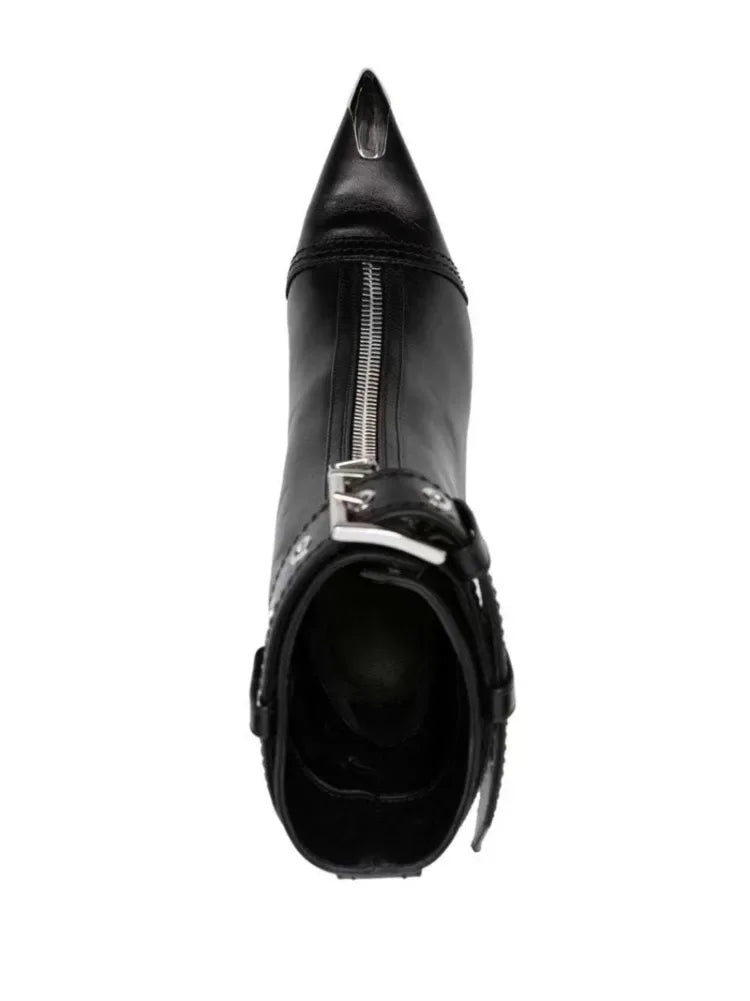 Handmade Women's Red High-Heeled Ankle Boots with Belt Buckle, Front Zipper, Pointed Toe, and Metallic Accent