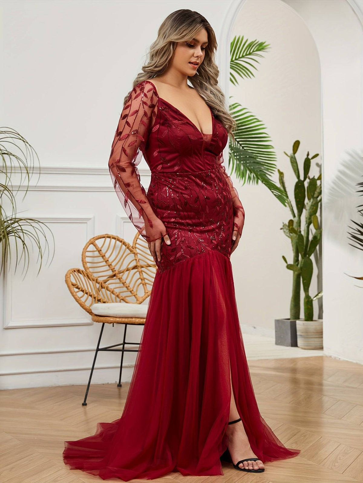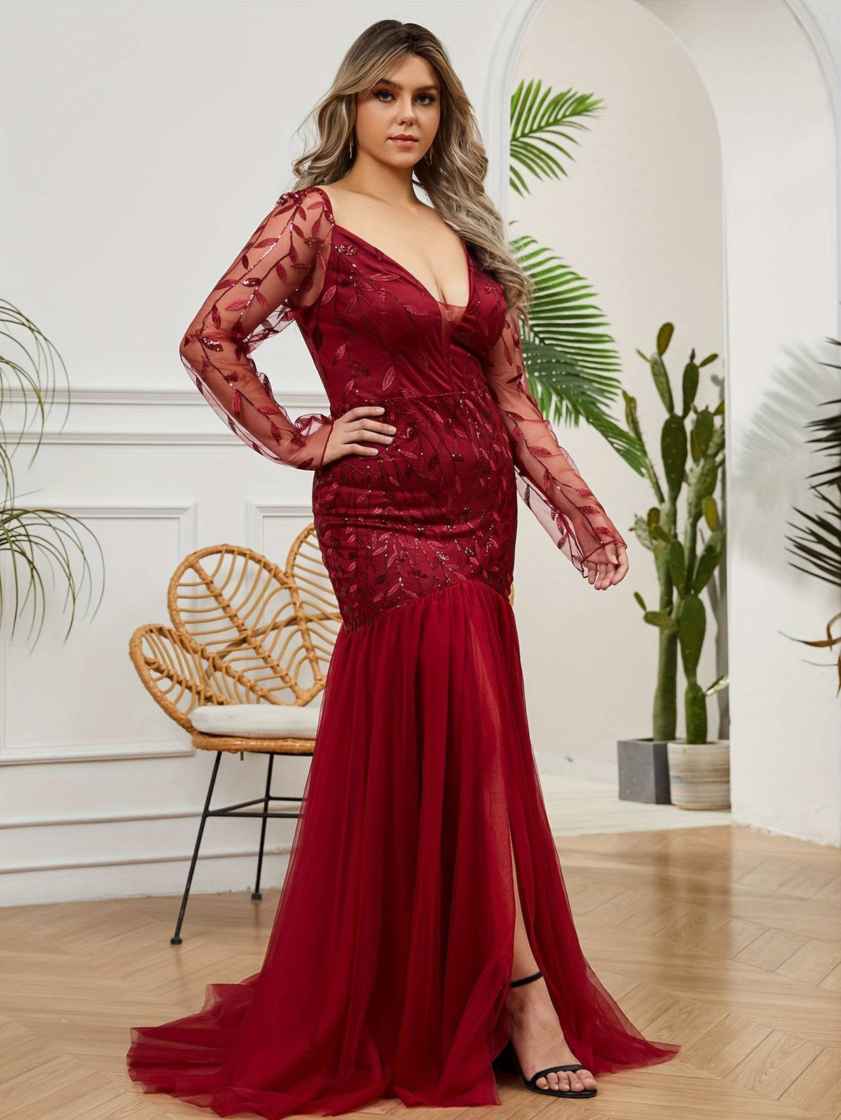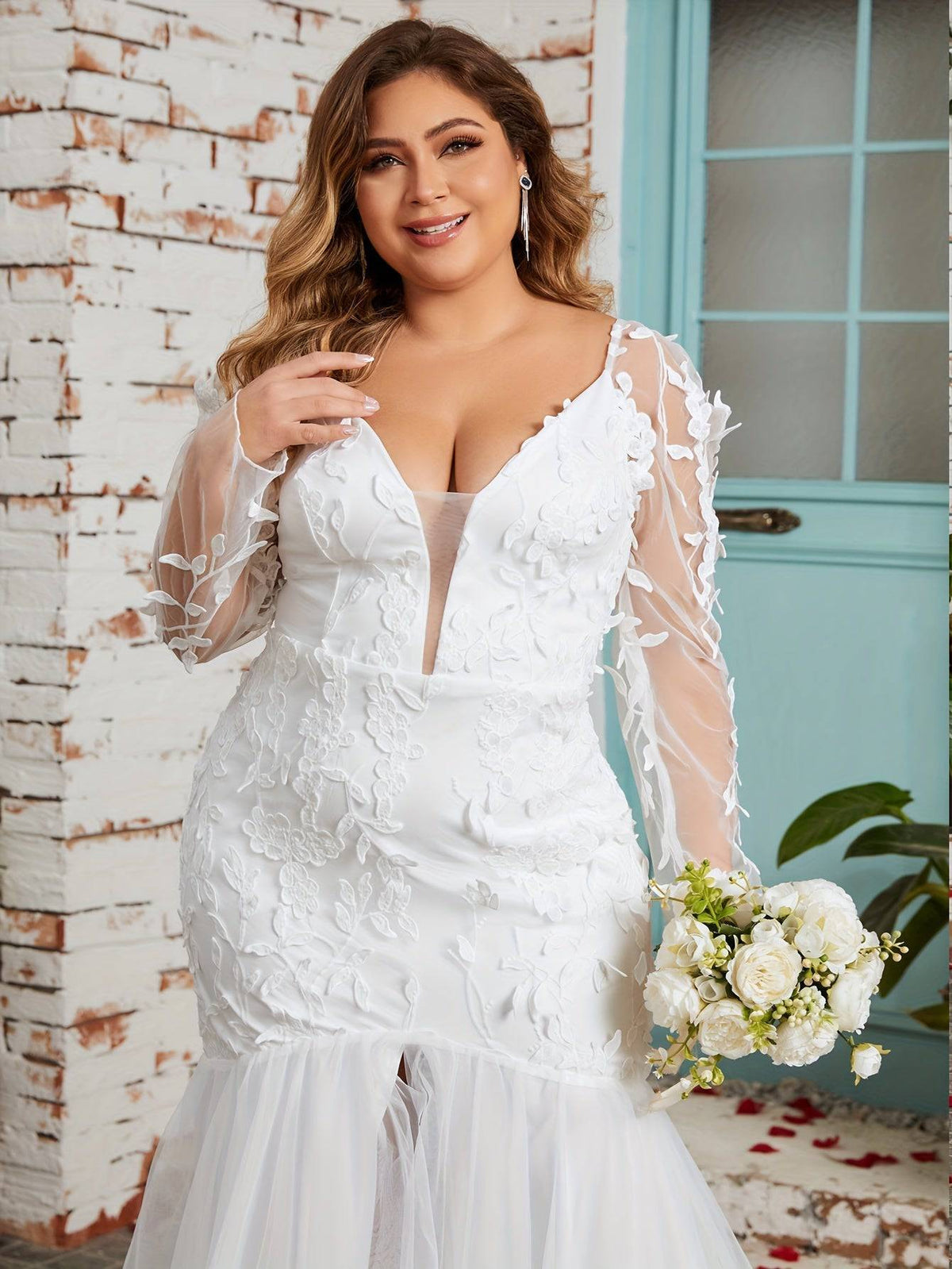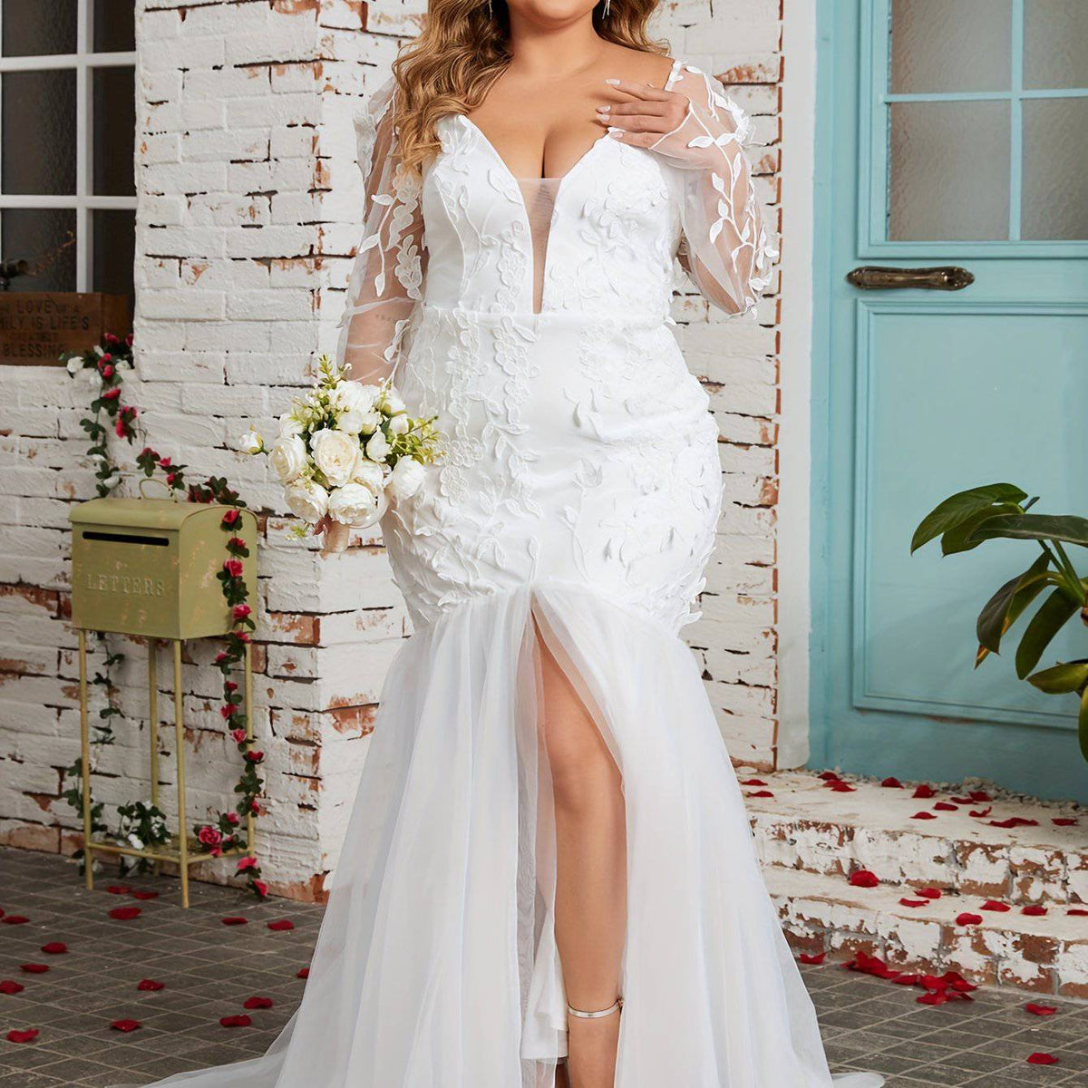 Plus Size Enchanting Mermaid Wedding Gown – Floral Mesh Detailing & Elegant Illusion Sleeves