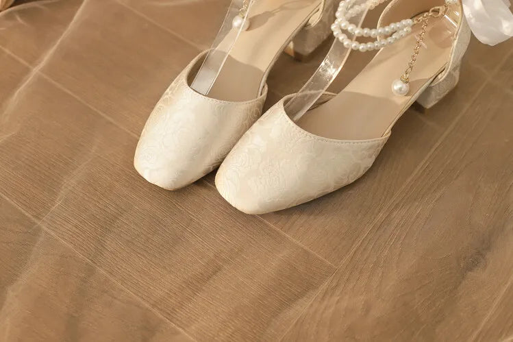 Satin Embroidered Pearl Chain Lolita Sandals - Retro 5cm Thick Heel Waterproof Platform Pumps