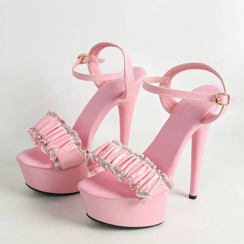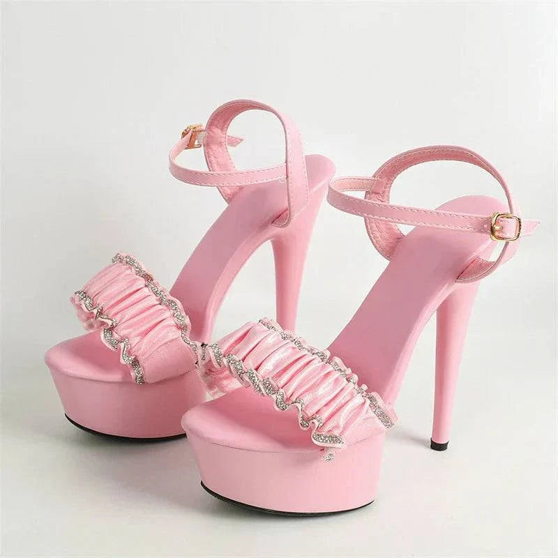 Step into elegance with the Veronique Atelier Crystal Pleated Platform Sandals, designed to make you shine at weddings, parties, or any special occasion. These stunning sandals feature a chic open-toe design, a crystal-embellished pleated upper, and a stylish buckle strap for a secure and fashionable fit. With a super-high stiletto heel and a 3-5 cm platform, these sandals offer a confident and glamorous silhouette that’s perfect for making a statement.