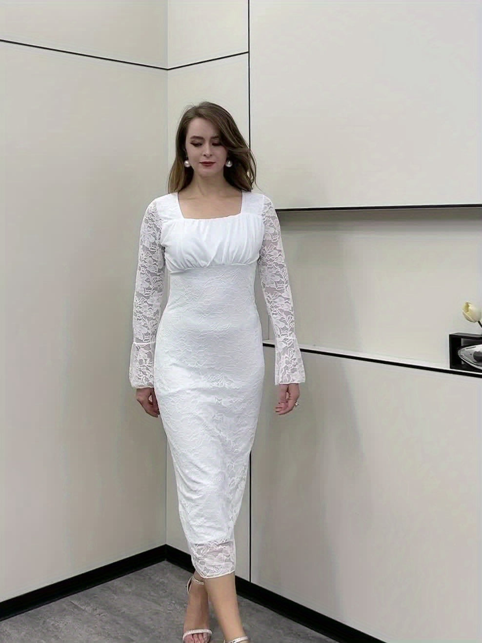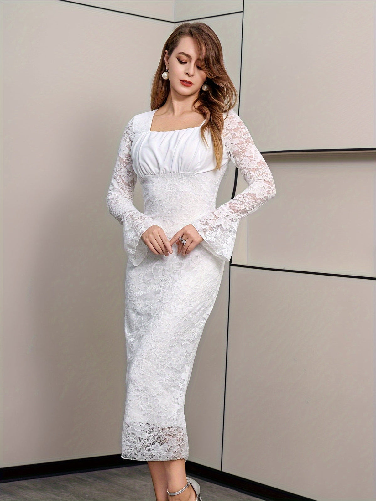 Veronique Atelier Elegant Lace-Trimmed Long Sleeve Bodycon Dress for Women - Square Neck Semi-Sheer Slit Hem Gown