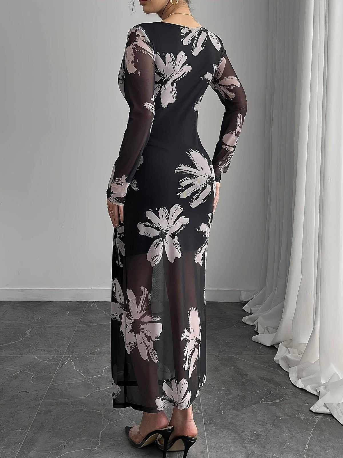 Floral Print Maxi Dress for Women – Black & Beige, Crew Neck, Fitted Long Sleeve, Polyester Knit