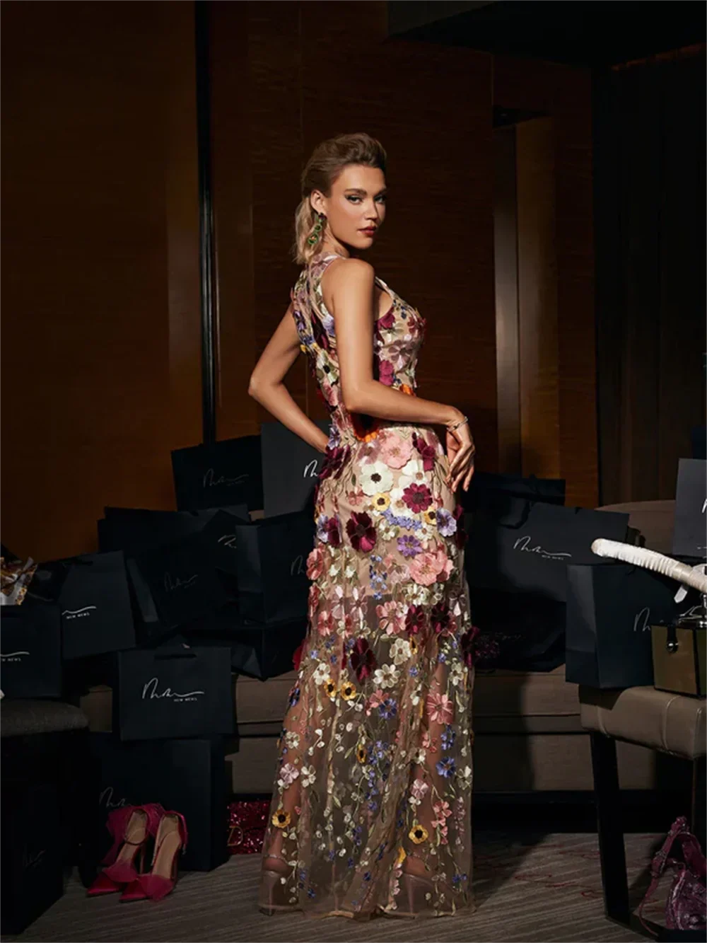 Flower Lace Embroidery Prom Dress - Crew-Neck Sleeveless A-Line Two-Layer Evening Gown