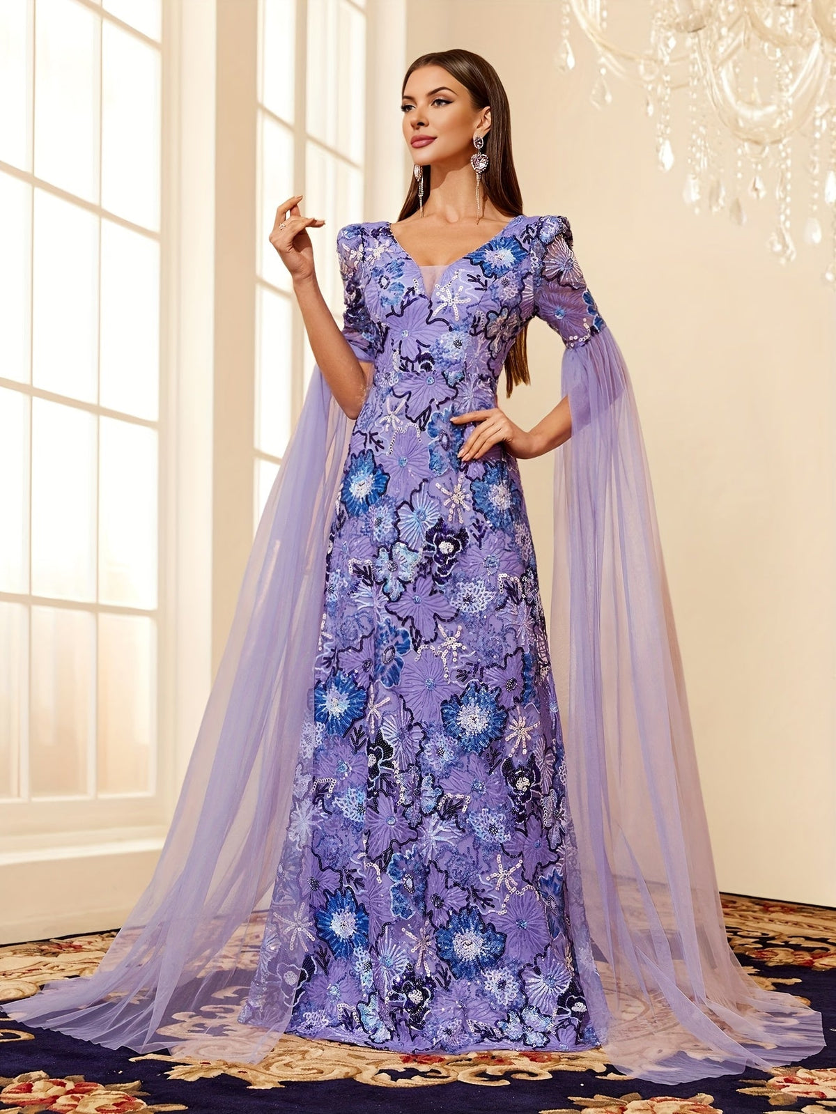 Step into sophisticated glamour with the Veronique Atelier Hand-Embroidered Sequin Floral Evening Dress, a stunning floor-length gown designed for weddings, gala events, performances, and elegant parties. Featuring delicate contrast sequin floral embroidery on a sheer mesh overlay, this bodycon silhouette dress accentuates curves while maintaining a refined and sophisticated appeal. The V-neckline and extra-long sleeves add a touch of grace, while the waist-concealing design and flowing large skirt ensure a flattering fit.