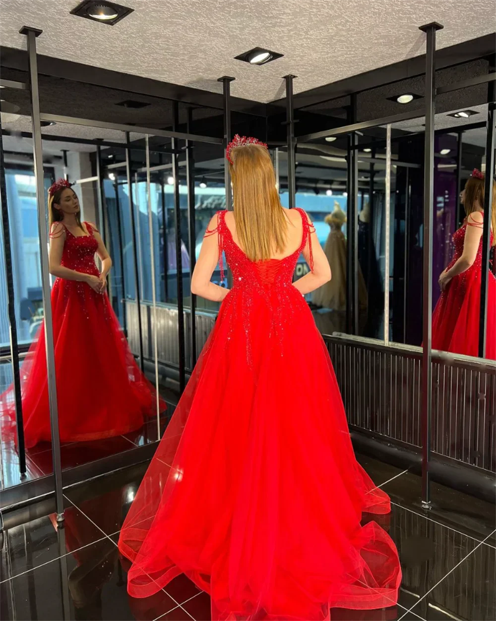 Veronique Atelier Sweet Red Wedding Dress with Embroidered Beads - Spaghetti Strap A-Line Tulle Gown