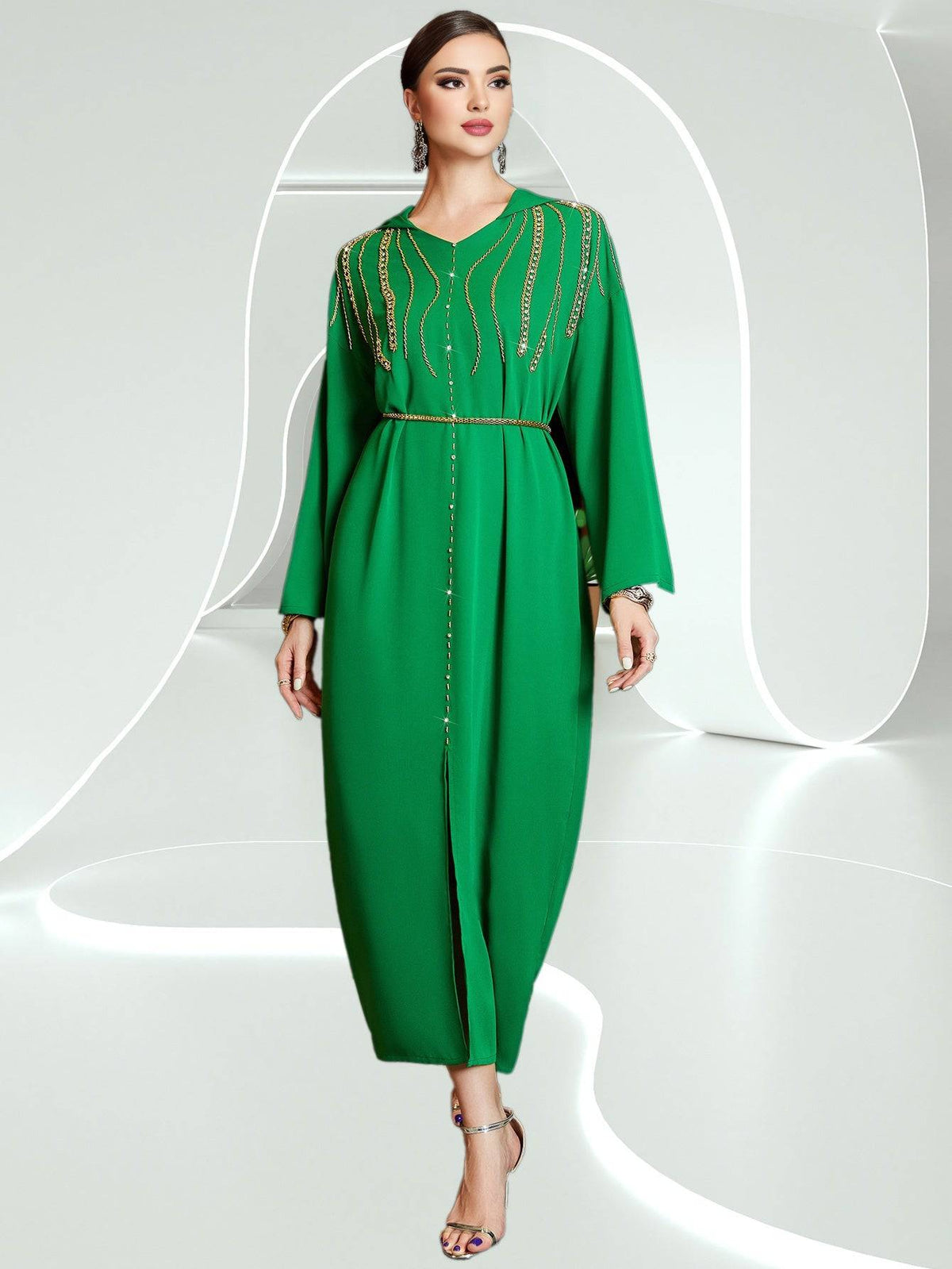 Elegant Handcrafted Rhinestone Kaftan Dress – Luxurious Long Sleeve Maxi for Women - UK 8 / Emerald Green
