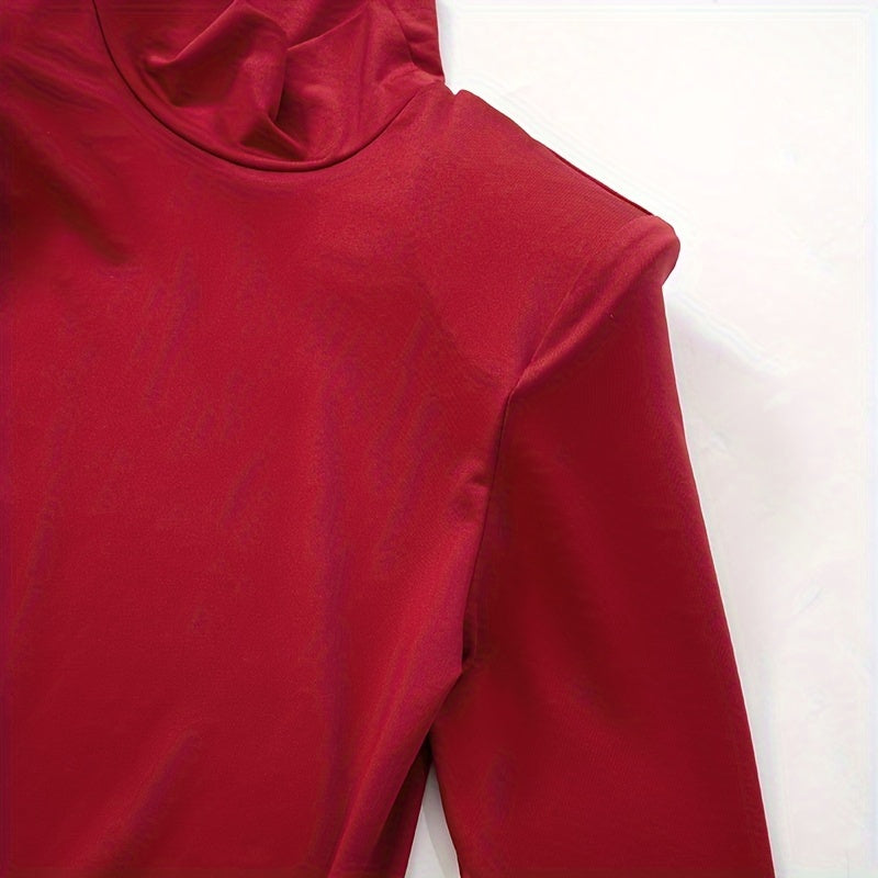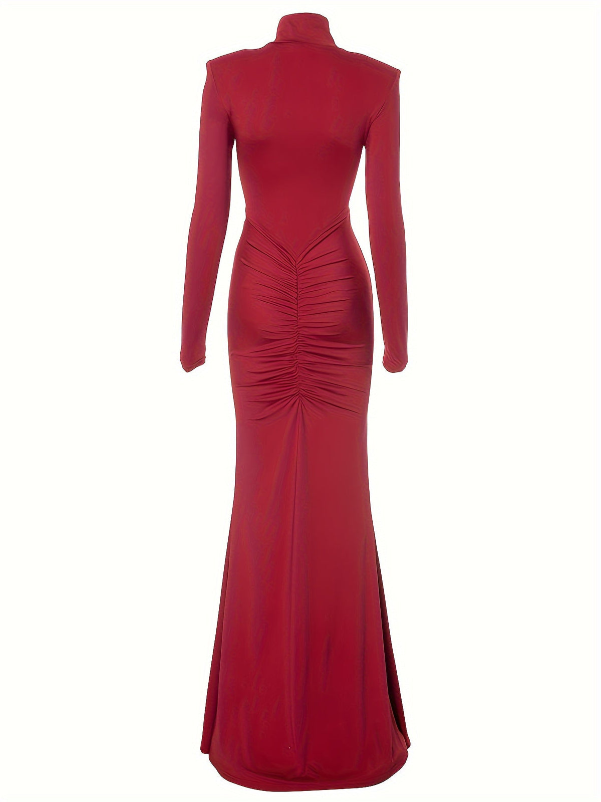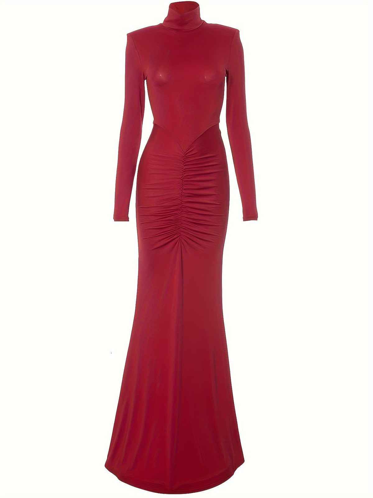 Women's High Collar Long Sleeve Mermaid Skirt – Elegant Pleated Floor-Length Gown - 【Red】 / UK 8