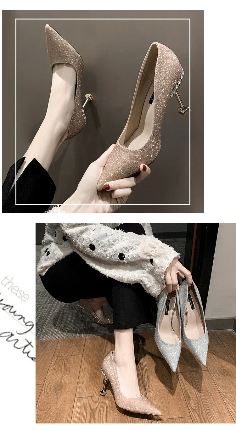 Elegant Stiletto Heels – Nude & Metallic Pointed Toe Dress Shoes with Pearl Detail for Bridal, Party & Special Occasions