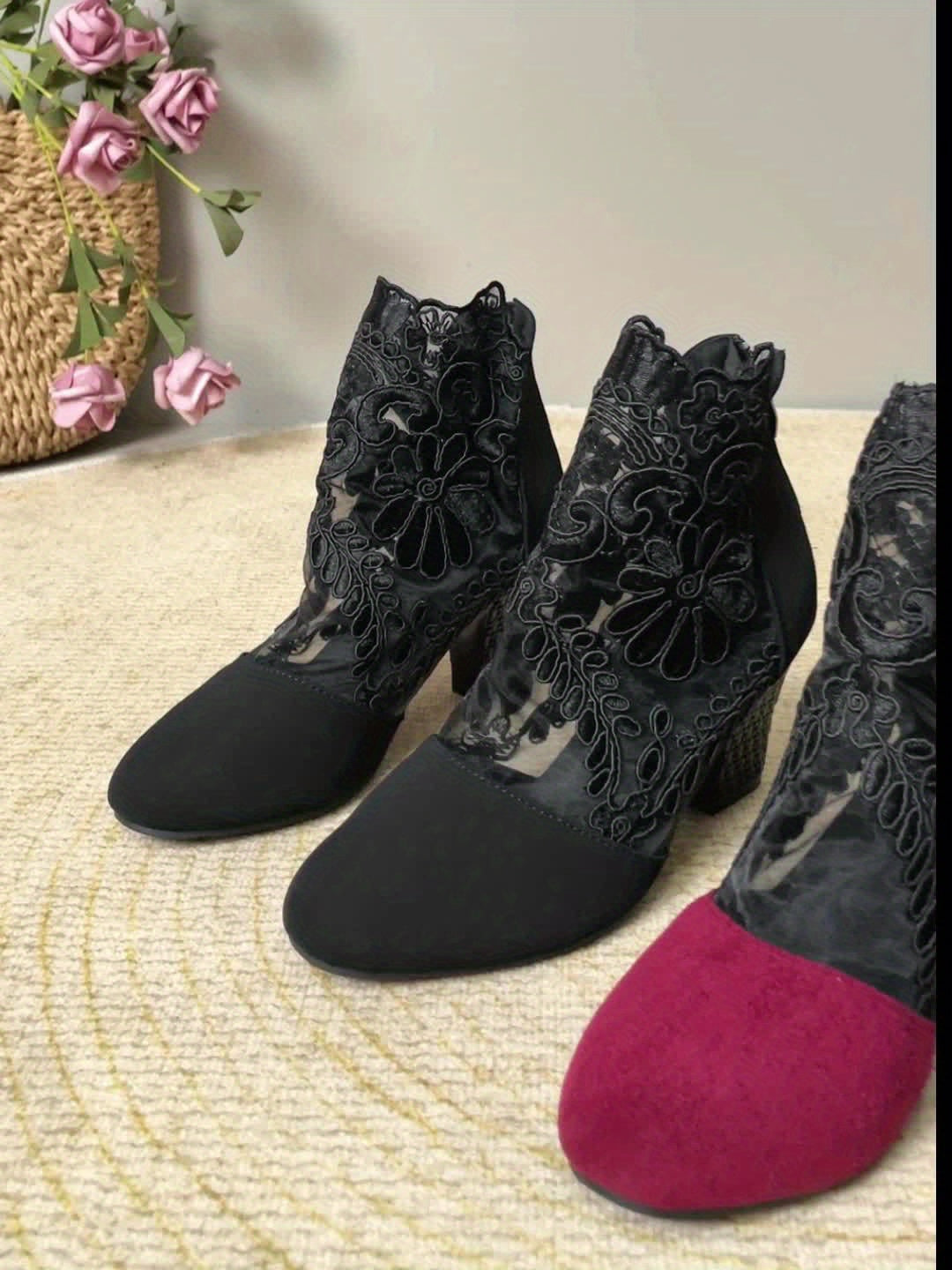 Floral Lace Mesh Wedge Heels – Elegant Square Toe Slip-On Mary Jane Shoes - Black / UK 3.5