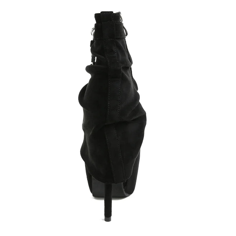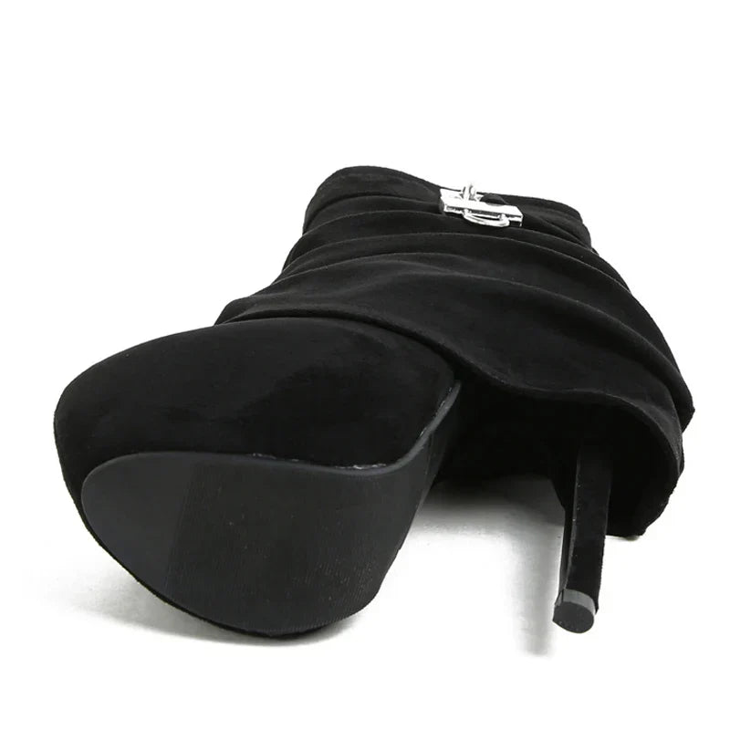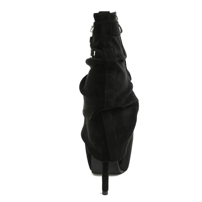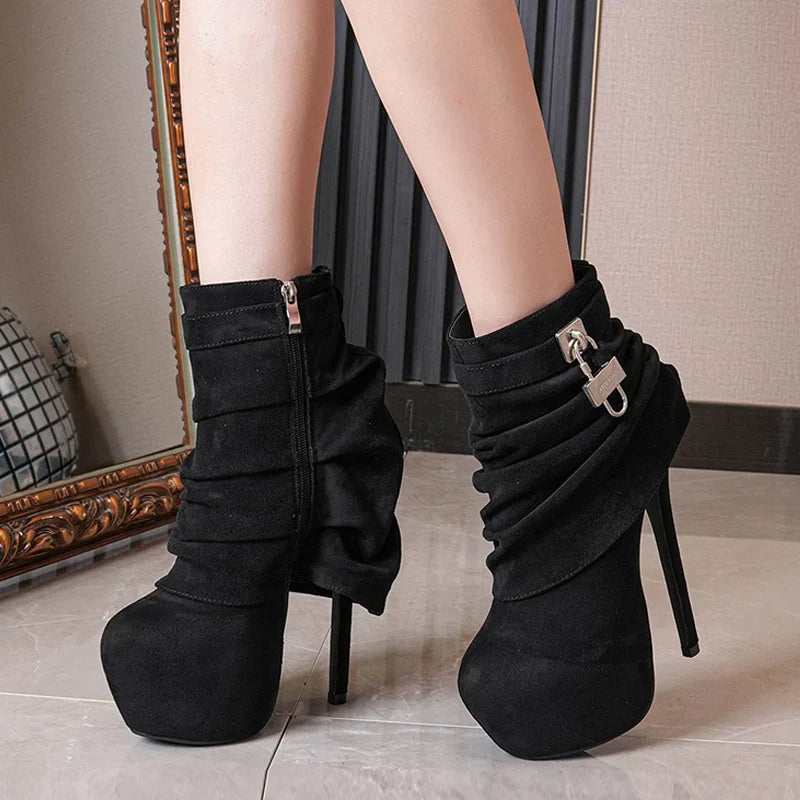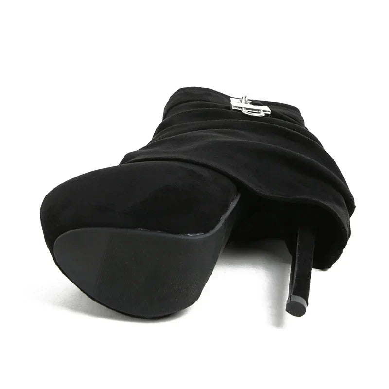 Step into bold style with the Veronique Atelier Extreme High Heel Platform Boots, designed for women who love to make a statement. These striking ankle boots feature a sleek round toe, a convenient zip closure, and a metal buckle detail for added flair. With extreme high heels and a 3-5 cm platform, these boots offer a confident and glamorous silhouette, perfect for pole dancing, nightlife, or any daring occasion.